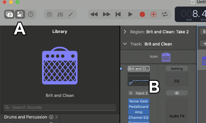 After quickly diagnosing the problem, we adjusted the input setting in Logic Pro from stereo to mono. Turning on the Inspector View (A) allowed us to change the input to Input 2 (B). This immediate fix solved the audio playback issue, allowing his guitar to be heard through both speakers.